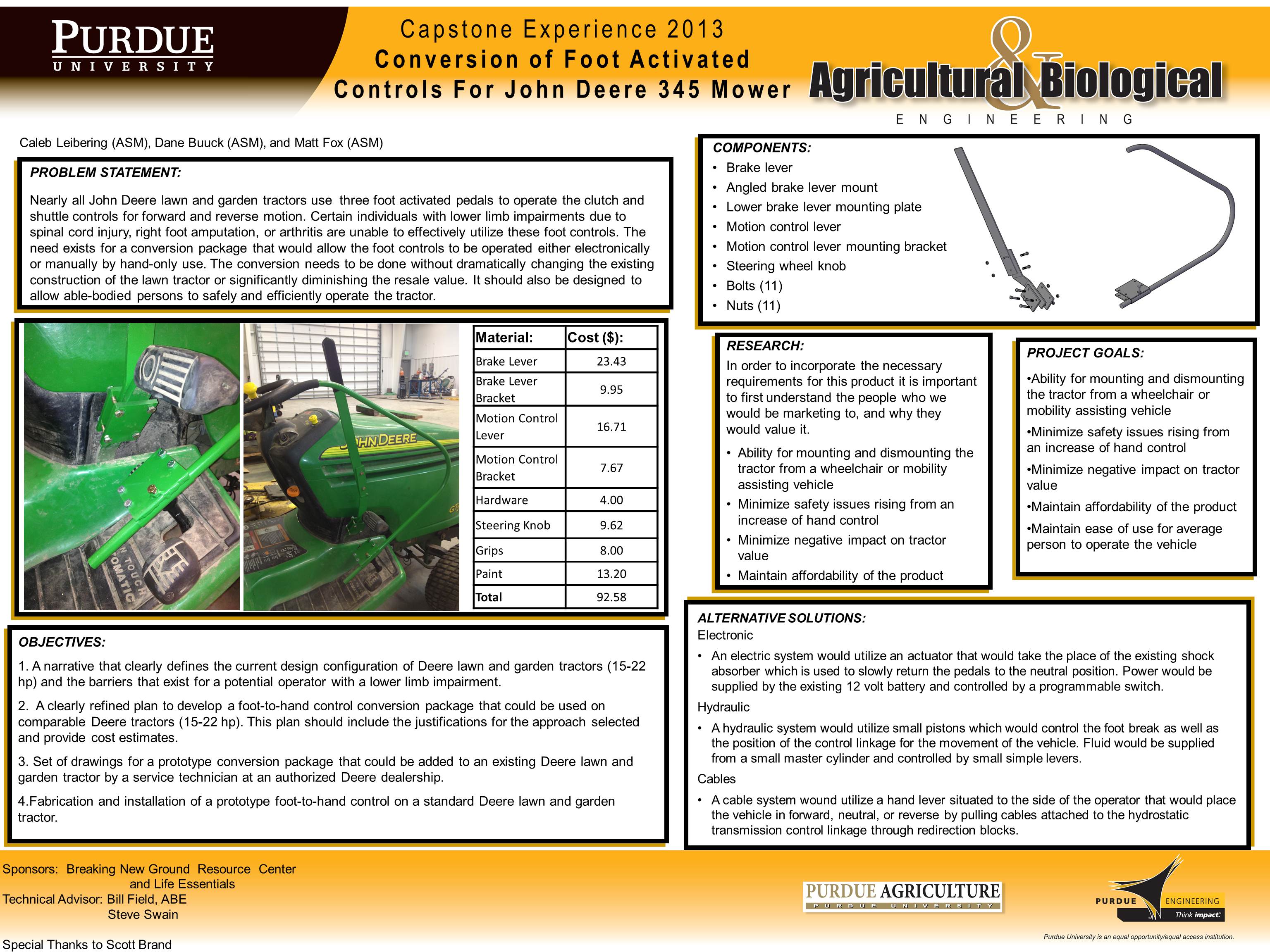 | Caleb Leibering, Dane Buuck, Matt Fox | Conversion of Foot-Activated Controls for John Deere 345 Mower |