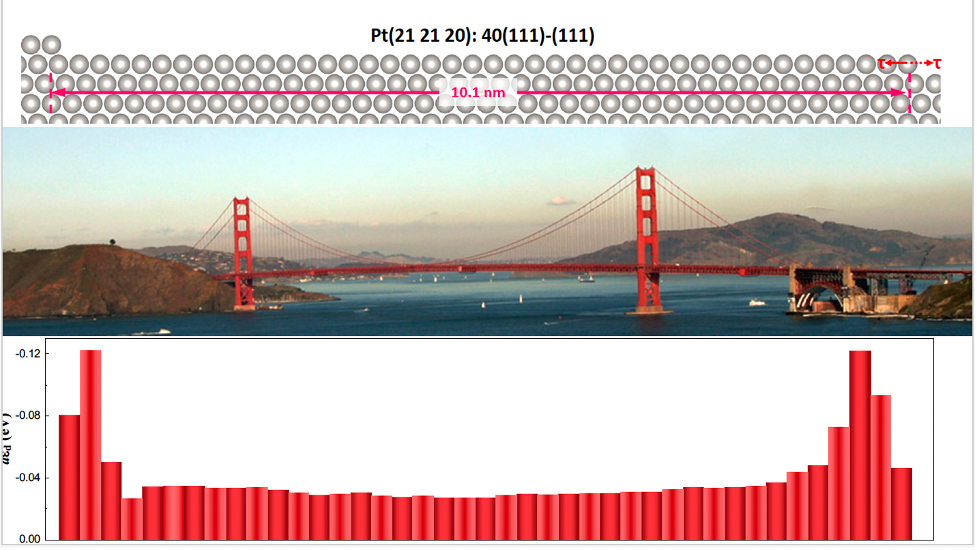 Figure (Above): No two sites are alike in local strain, electronic structure (d-band center) and surface reactivity. For example, for the d-band center, the overall shape is like a two-tower suspension bridge. One tower is on the upper step, and another tower is on the lower step. Maxima of atomic site-specific strain and d band center shift are located around both sides of the step edges. Minima are located away from the step edges.