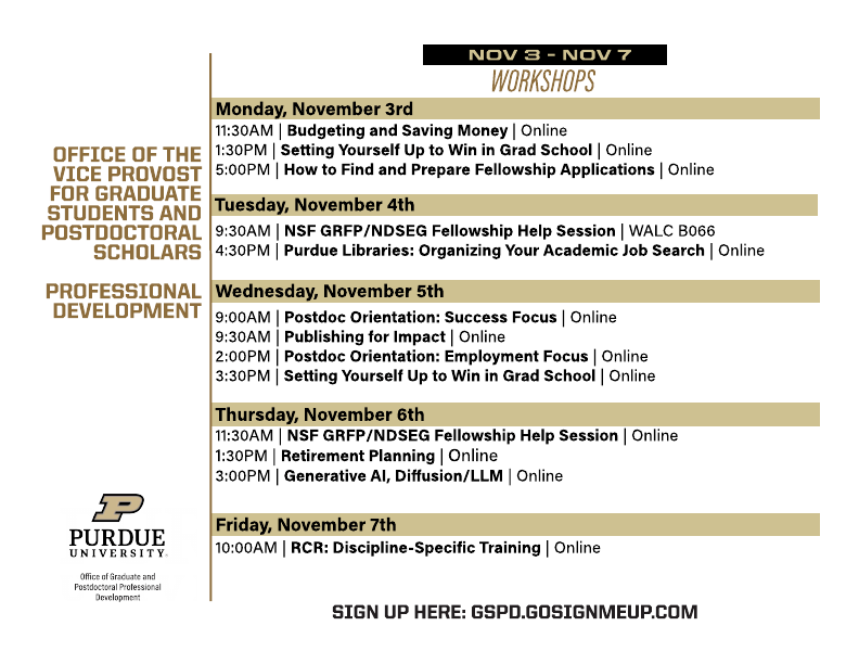Below are next week’s workshop offerings. Kindly share this information with your graduate students and postdoctoral scholars, and feel free to post it on relevant channels.