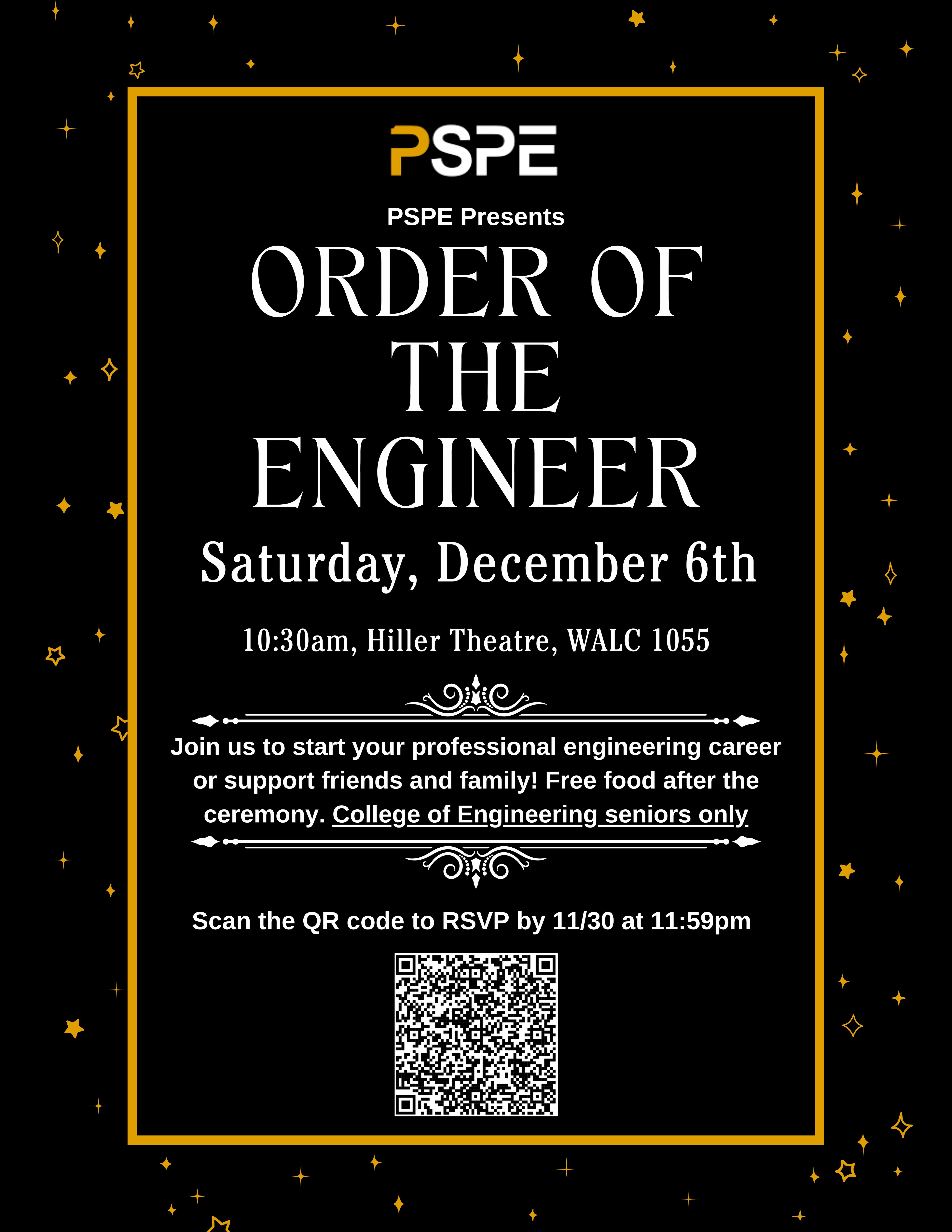 My name is Maddie Little and I am the current president of Purdue Society of Professional Engineers (PSPE). We are having our Fall Order of the Engineer ceremony on Saturday, December 6th at 10:30am in Hiler Theater (WALC). To receive a ring at this ceremony you must be a graduating or graduated senior from the College of Engineering.