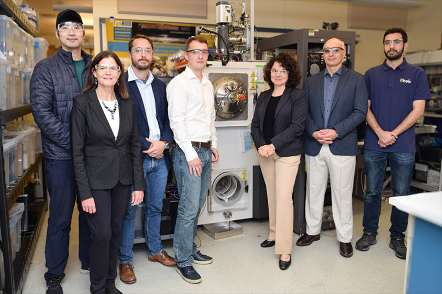 Members of the LyoWave and LyoHub teams stand next to their device, a microwave emitter developed at Purdue University that vastly reduces the time needed to freeze-dry vaccines and other pharmaceutical products. LyoWave has licensed the technology from the Purdue Innovates Office of Technology Commercialization and entered a joint development collaboration with Millrock Technology. (Purdue University photo/Alan Cesar)