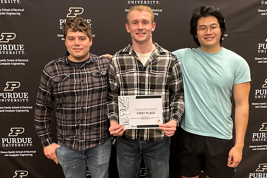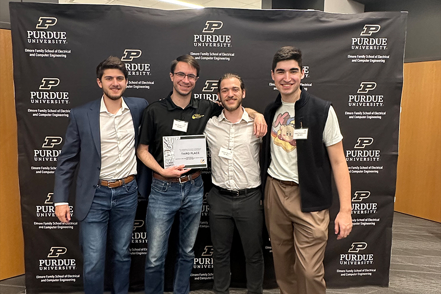 Spectrum Defense Systems won first place with a product called DRES (Dynamic Radio Emulator System). DRES is the basis of a startup, Spectrum Defense Systems, which was founded by team lead Joseph Petersen in Fall 2023. Petersen used senior design to develop DRES, which is an RF emitter system designed for the U.S. military, specifically for training, deception, and jamming operations. The emitters replicate various military RF signatures and are controlled wirelessly via a mesh network from a central interface. In addition to Petersen, team members were Derek Fronek, Edmund Leung, and Aditya Agrawal.