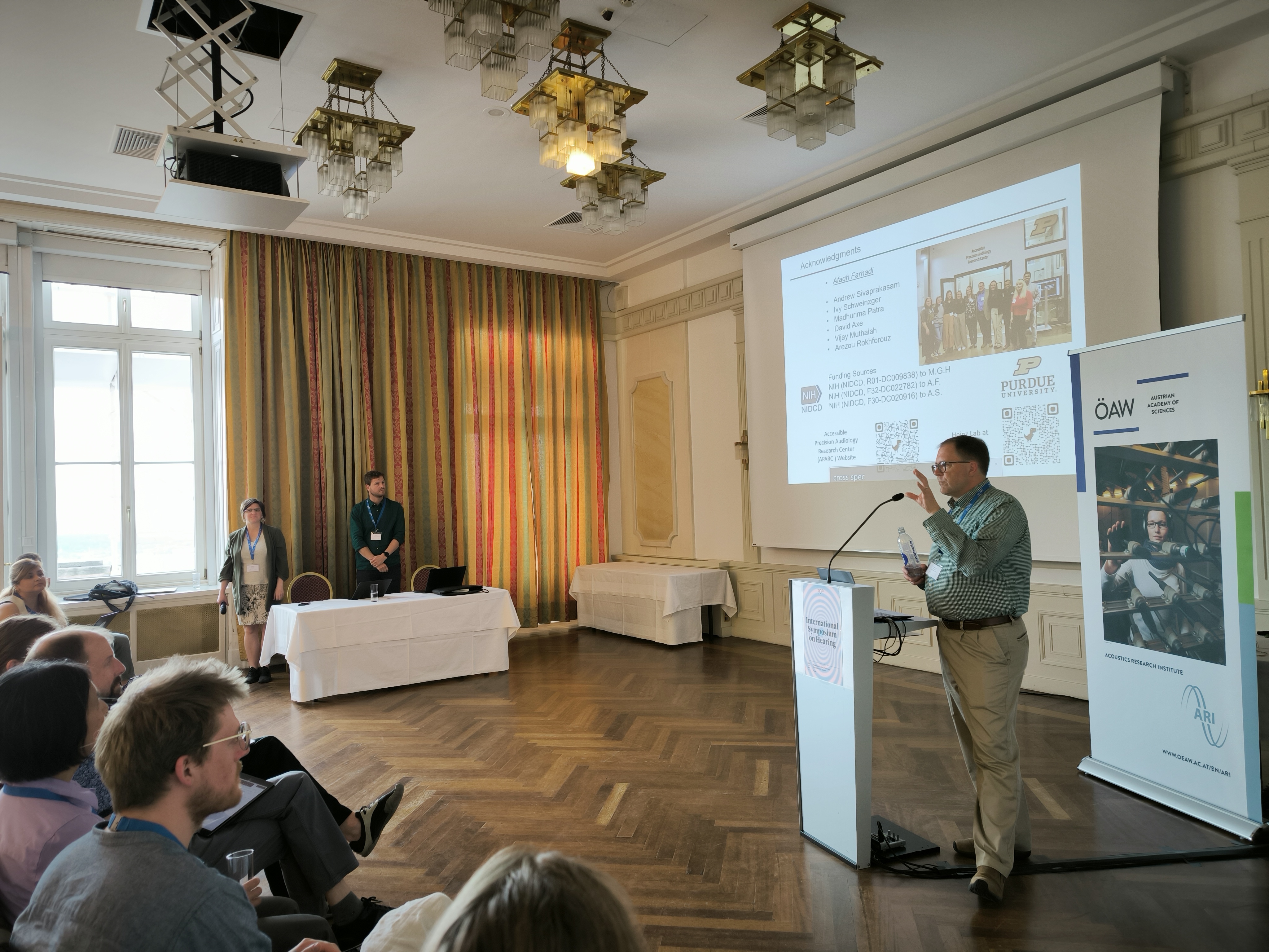 Dr. Michael Heinz (PI) and Dr. Afagh Farhadi (postdoctoral researcher) from the Heinz Lab recently attended the 2025 International Symposium on Hearing (ISH) in Vienna, Austria, a premier conference in auditory science. The meeting featured outstanding talks and posters focused on physiology, psychophysics, and computational modeling.