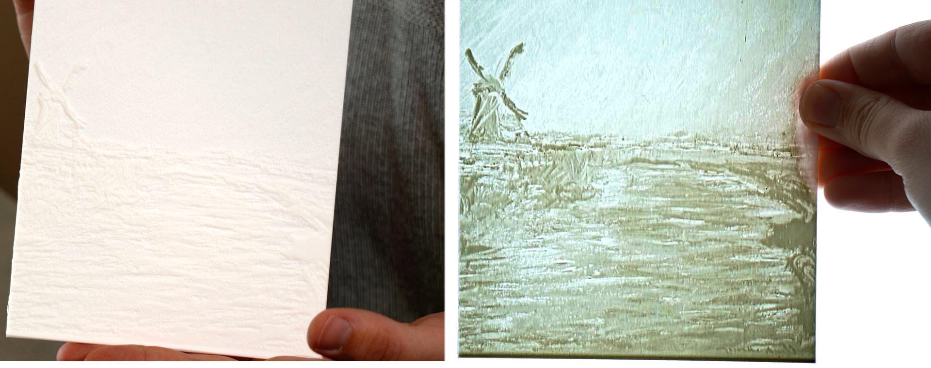 The imperceivable thickness differences magically convert into a chiaroscuro of dark and light, transforming the mundane pieces of white plastic into water lilies, sailboats, tulip fields, and even photographs.