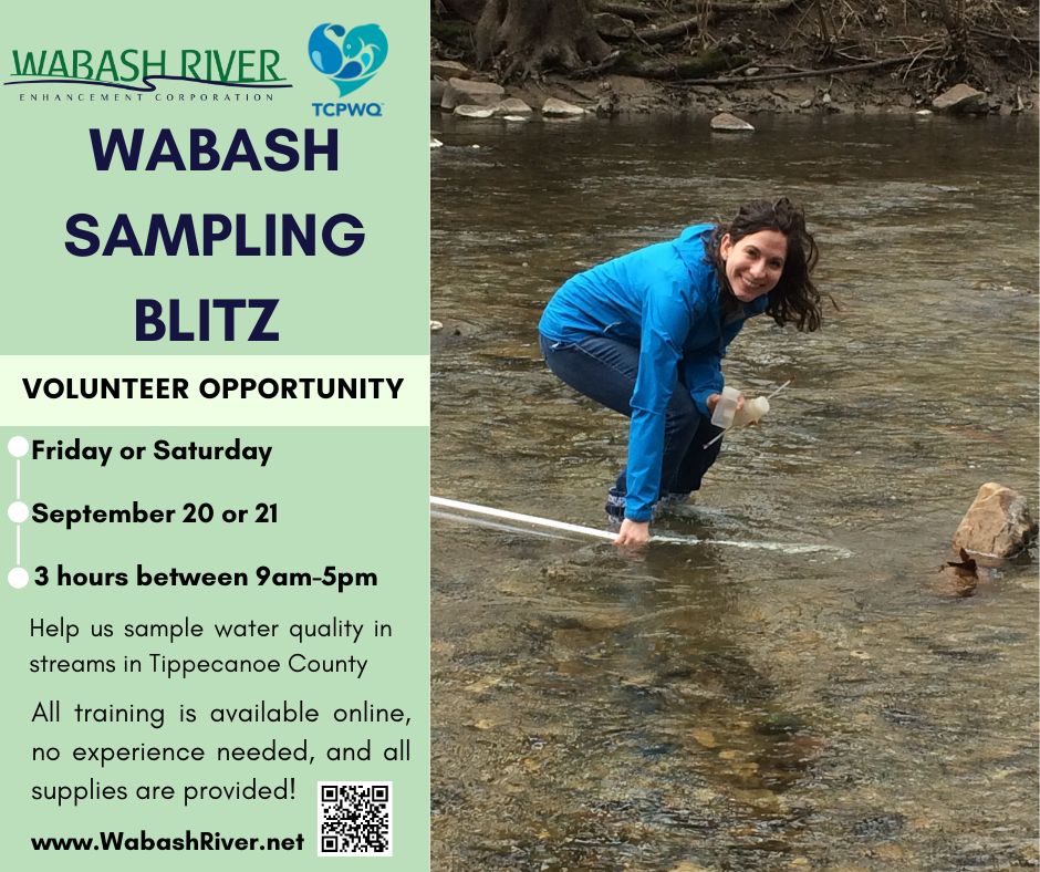 See this flyer advertising the fall Wabash Sampling Blitz; the volunteer citizen science event to sample streams feeding the Wabash River.  The event crosses two days, and volunteers can sample at the time that is most convenient to them during those two days.  The dates are Sept 20 and 21.