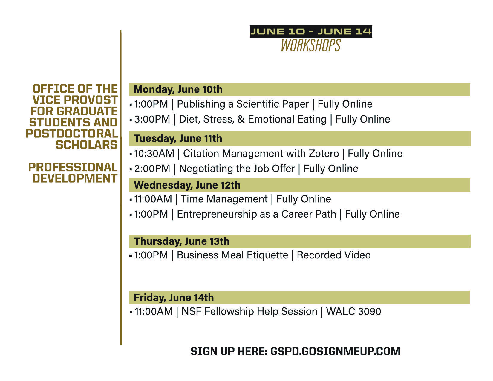 The Office of Graduate Professional Development will hold workshops the week of June 10.