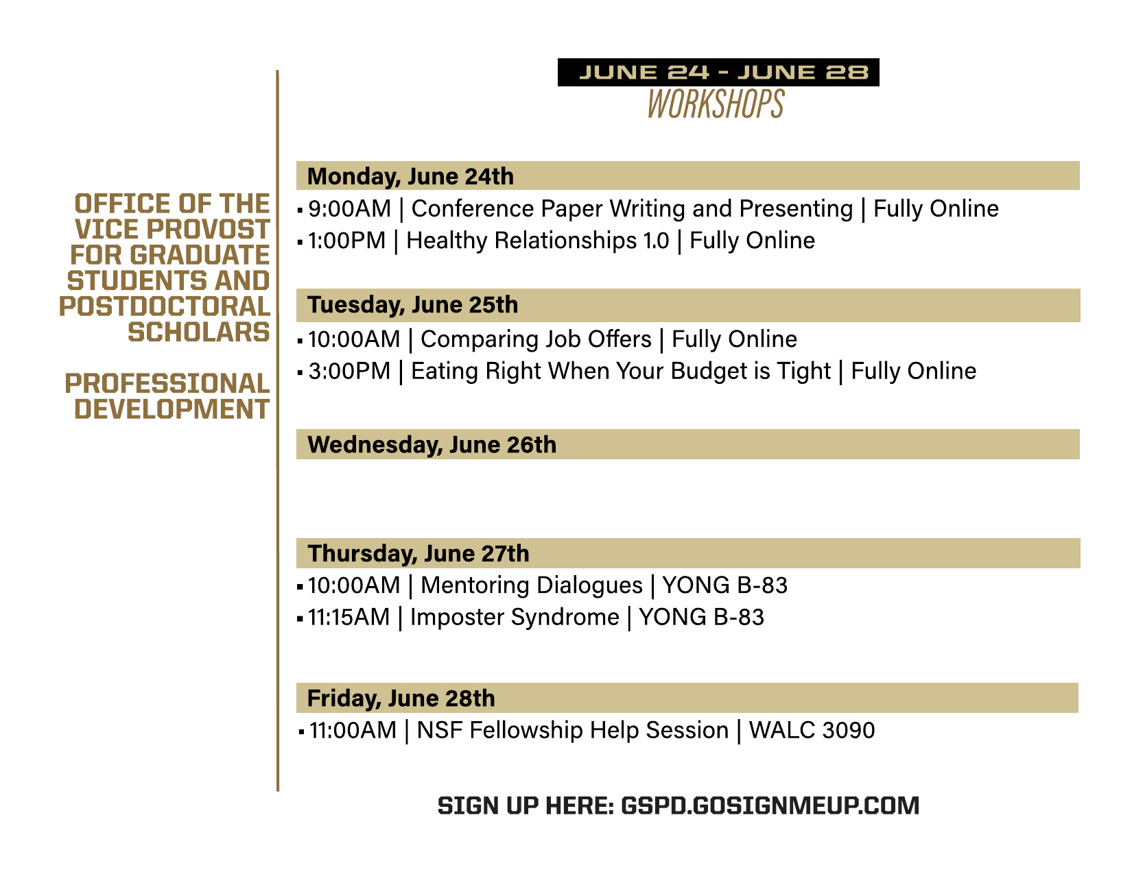 The Office of Graduate Professional Development will hold workshops the week of June 24.