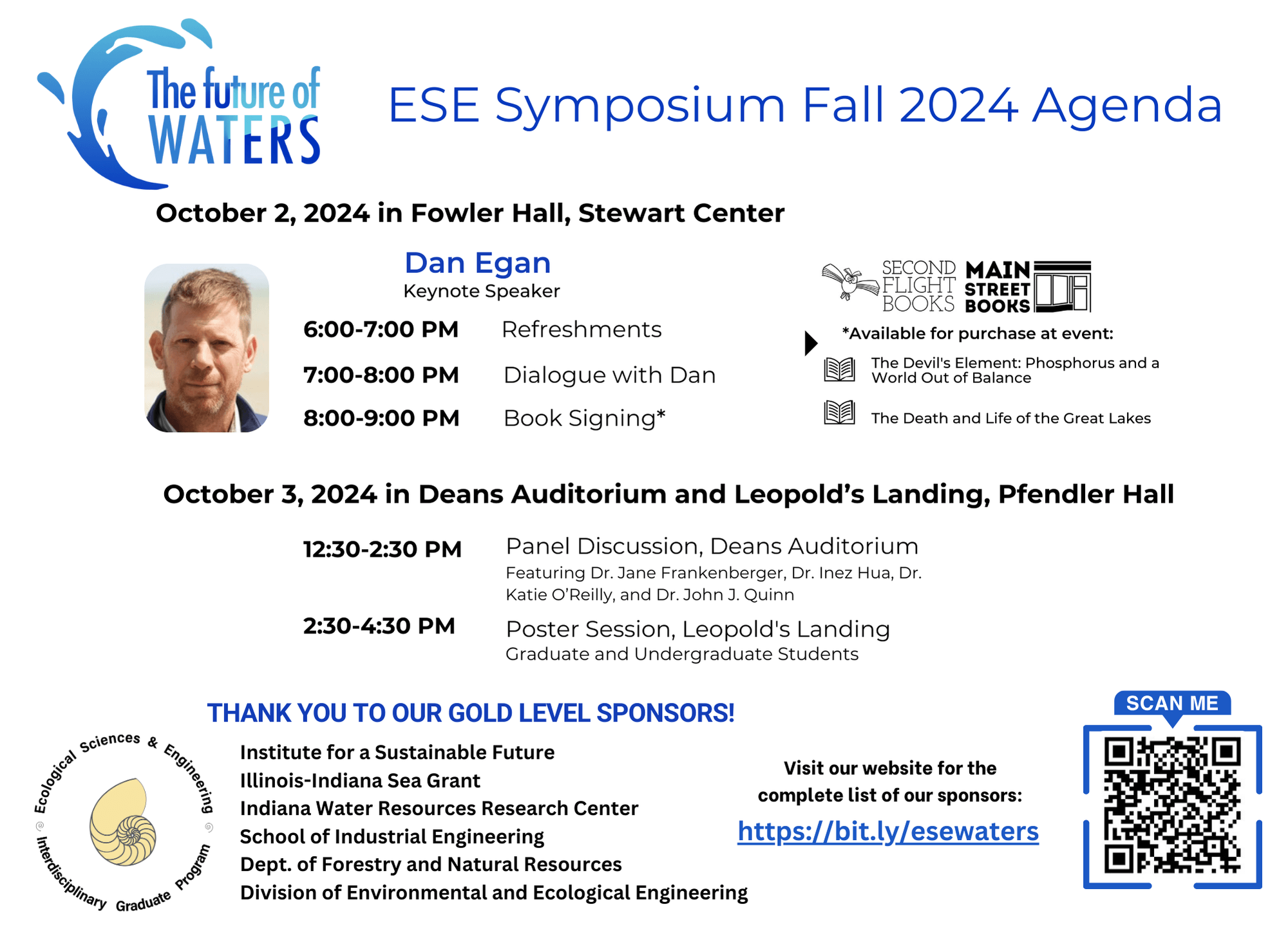 Save the date for the 2024 annual Ecological Sciences & Engineering symposium on October 2-3, 2024, The Future of WATERS: Wellbeing, Access, Technology, Ecological Impacts, Resilience, Sustainability, addressing issues such as water quality, security, policy, and access. Featuring transdisciplinary panel discussions, a keynote dialogue and book signing with New York bookseller Dan Egan, and a poster competition, this two-day event aims to foster open dialogue on the multifaceted challenges facing the water sector and generate innovative solutions and strategies for a sustainable water future. Open to the entire Purdue University, the Greater Lafayette community, and beyond, we invite students, faculty, staff, and the public to join us in exploring these critical issues.